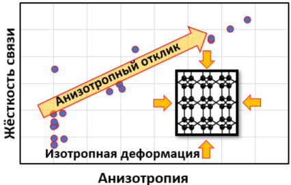 Мы решили изучить эту проблему глубже. Одним из ключевых отличий между алмазом и другими углеродными структурами является то, как их химические связи реагируют на давление. Атомные связи в алмазе невероятно жёсткие, но в некоторых новых углеродных структурах эти связи могут быть ещё жёстче. Это говорит о том, что такие материалы могут быть более устойчивыми к сжатию. Однако, когда мы начинаем изучать, как эти структуры реагируют на давление, оказывается, что их деформация происходит неравномерно. Такое поведение, называемое анизотропной деформацией, снижает общую жёсткость материала, несмотря на высокую жёсткость отдельных связей.